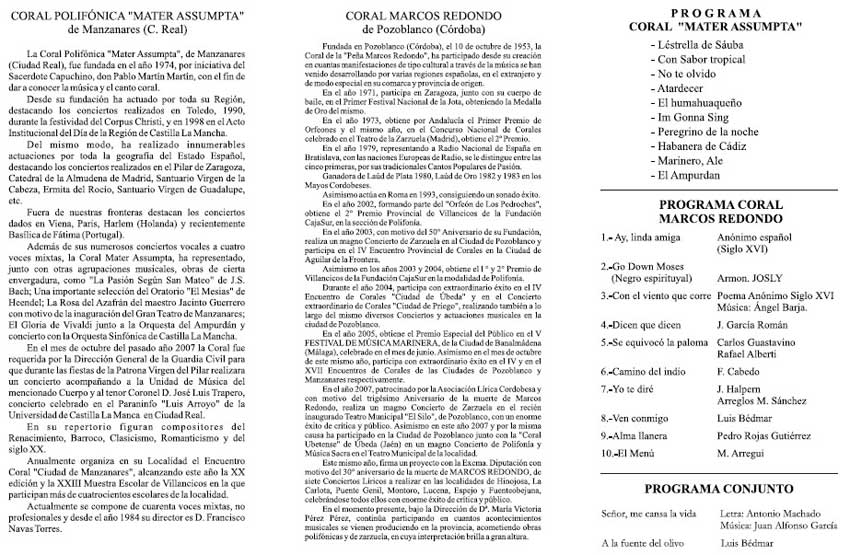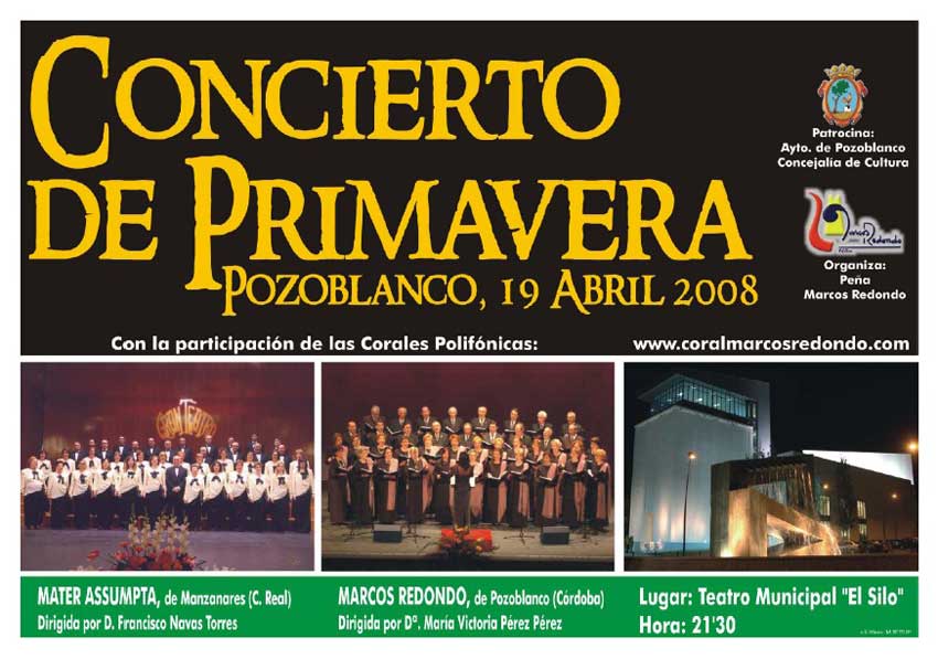 Día 19 de abril de 2008 (sábado): Concierto de Primavera en el Teatro Municipal "El Silo" de Pozoblanco a las 21'30 horas. Actuación de las Corales Mater Assumpta de Manzanares (Ciudad Real) y La Coral de la Peña Marcos Redondo.