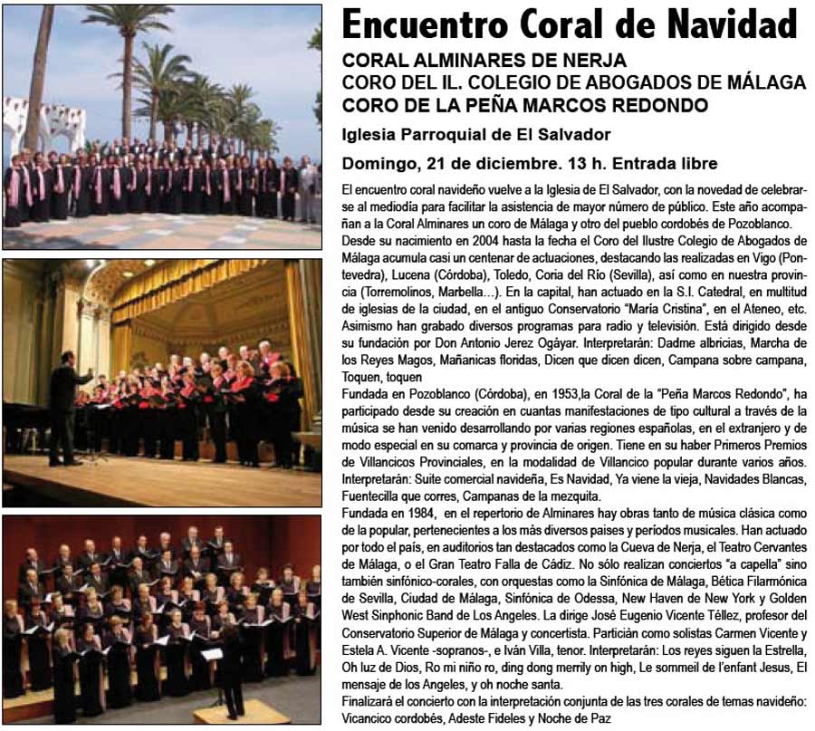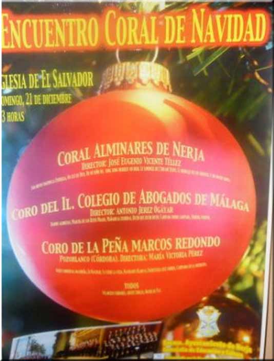 Día 21 de diciembre de 2008 (domingo): A las 13 h. en la Iglesia Parroquial de El Salvador de Nerja (Málaga) "Encuentro Coral de Navidad" con la participación de Coral Alminares de Nerja, Coro del Ilustre Colegio de Abogados de Málaga y Coral de la Peña Marcos Redondo.