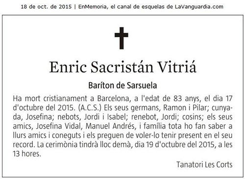 FALLECE ENRIQUE SACRISTÁN El sábado, 17 de octubre de 2015, falleció a los 83 años el insigne barítono ENRIQUE SACRISTAN alumno predilecto del genial Marcos Redondo. Descanse en paz. Comenzó a formar parte de la "Agrupación lírica Marcos Redondo" de Pueblo Nuevo (Barcelona), contando con más de setenta obras en su repertorio. A nivel personal y artístico, mantuvo una excelente amistad con el gran barítono Marcos Redondo, del cual recibió clases de canto y los mejores consejos, pasando a ser uno de sus discípulos predilectos, así lo afirmaban el mismo gran cantante y corroboraban sus hijas Maruja y Carmen. |