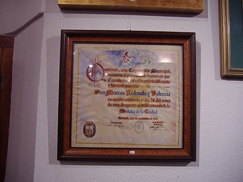 El día 24 de Noviembre de 1893 nació en esta casa el eminente barítono Marcos Redondo Valencia, hijo predilecto de esta ciudad, gloria del Teatro Lírico Nacional |
